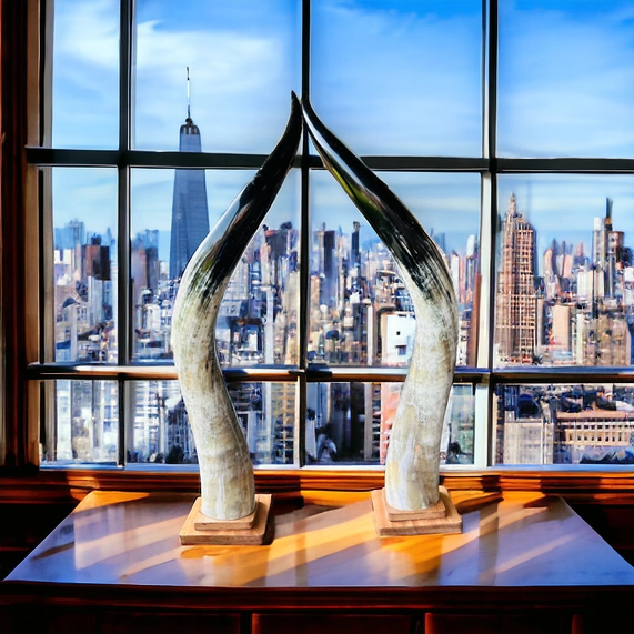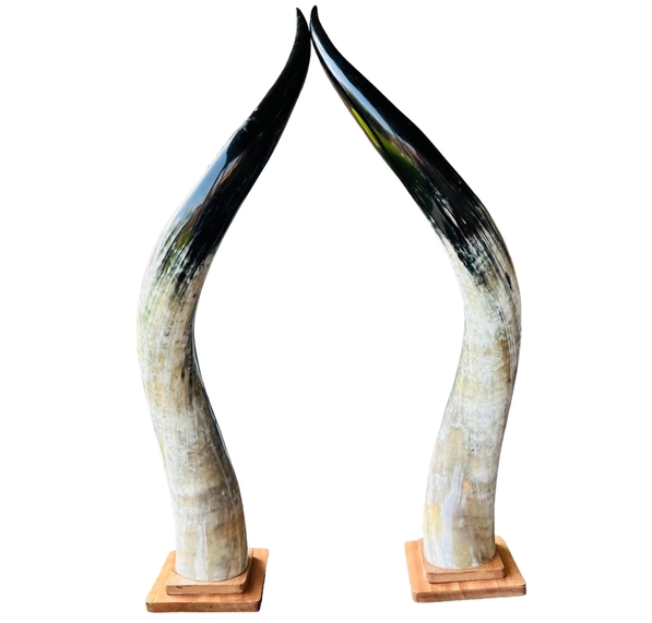 These majestic Kabaka Ankole Horns make a bold statement and are best displayed on a large dining room table, mantel, TV console, Coffee table or in front of a fireplace. * Handmade in small batches by skilled Ugandan artisans * Two-piece horn set * approx. 33" height * 100% Ankole cow horn, ethically & locally sourced as a food by-product (animal was not killed for the creation of the product) * Each piece is meticulously sanded, polished, and then sealed with a waterproof lacquer * All of our products are handcrafted by skilled artisans from natural Ankole cow horn. Each unique piece features natural color variations finished with a luster that highlights the beauty of the item.