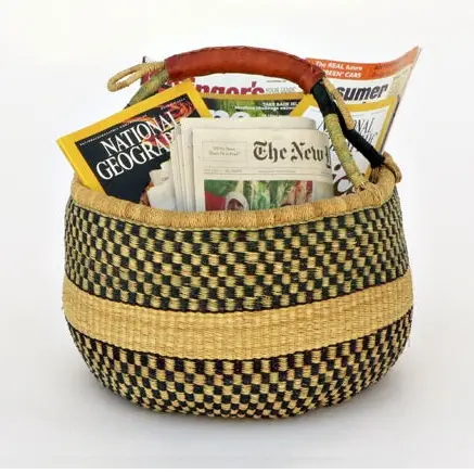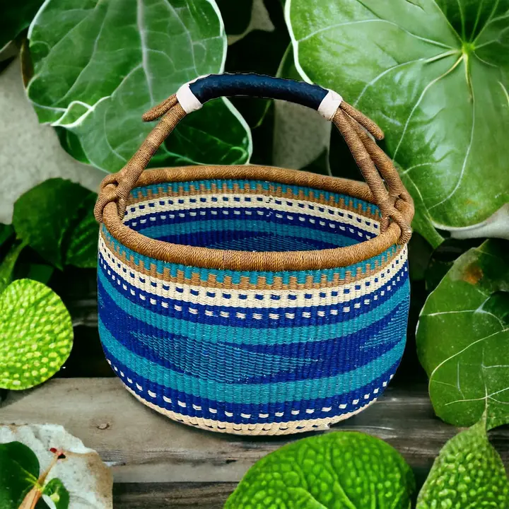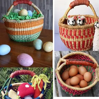 African Market Basket - Ghana Bolga market basket makes a great gift basket!These baskets are a traditional shape from the Bolgatanga region of Northern Ghana. Artisans in the Bolgatanga region of Ghana weave these beautiful and durable baskets from thick, tough elephant grass. Bolga basket is a very popular size for children, green shoppers, busy mothers and picnic planners worldwide. Handwoven in Ghana made from local elephant grass. Each basket is one of a kind, in a unique pattern, and he leather wrapped handle adds to the durability. Incredibly sturdy and versatile basket is the perfect home accessory, plant pot, toy basket, Easter egg basket, or market basket.  Please note:  To reduce postage costs and packaging these baskets are flattened for postage, this does not harm them in any way, and simple instructions on how to reshape the baskets are included, once wet they pretty much bounce back to the original shape with a little help from you