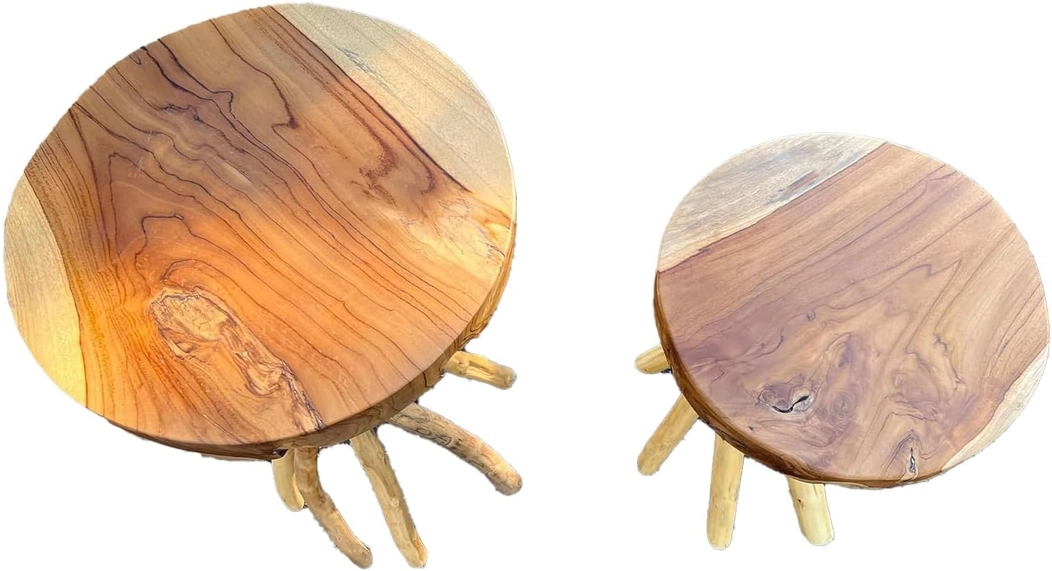 Hand Crafted Solid Teak Wood End Table - Made From Sustainable Teak Wood With A Satin Finish. Embrace Artistic Expression With A Style That Highlights Bold Designs With Sleek Lines, Neutral Elements, And A Minimalist Contemporary Aesthetic. Hand Crafted From A Beautiful, Organic Slab of Teak Wood, It Features A Rich, Warm Finish Combined With An Intricate Tree Ring Design Ensuring A Unique, One Of A Kind Piece. Handcrafted Design: This solid teak end table features a unique live edge top with intricate branch-like legs for a rustic, natural appeal. Sturdy Construction: Crafted from high-quality teak wood, ensuring long-lasting durability and stability. Compact Size: This table fits conveniently in small spaces and is approximately 18 inches in diameter and 24 inches tall. Reference Size: The normal size is around 15.7" x 15.7" x 27.5"H. Due to the variety of shapes, so there are some differences in size between different shapes of table Materials: Solid Teak